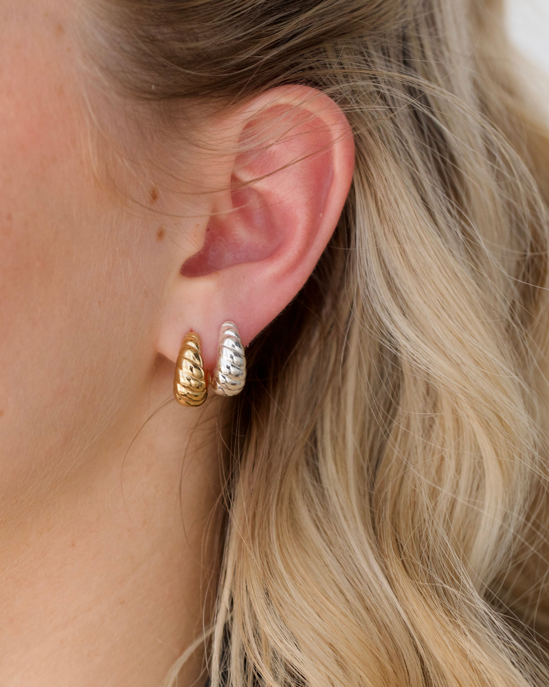 The bold one in the bunch. Our Nova Twist Huggies are the big sister to the Mini which are designed chunkier, curvier, and made to be seen. With that signature twist and 18K Gold Vermeil finish, they’re part of our Luxe range and bring a sculptural edge to any look.