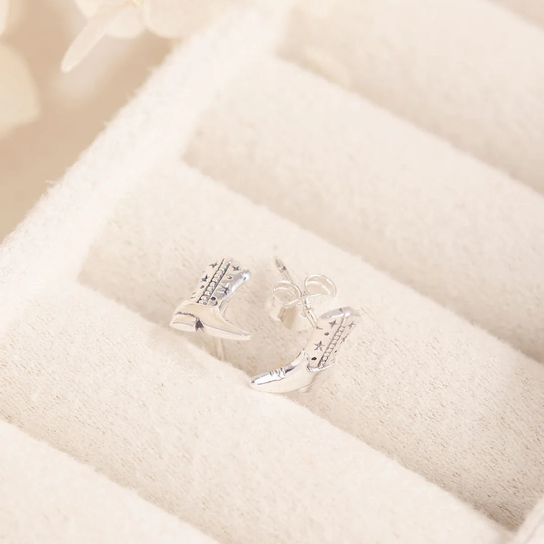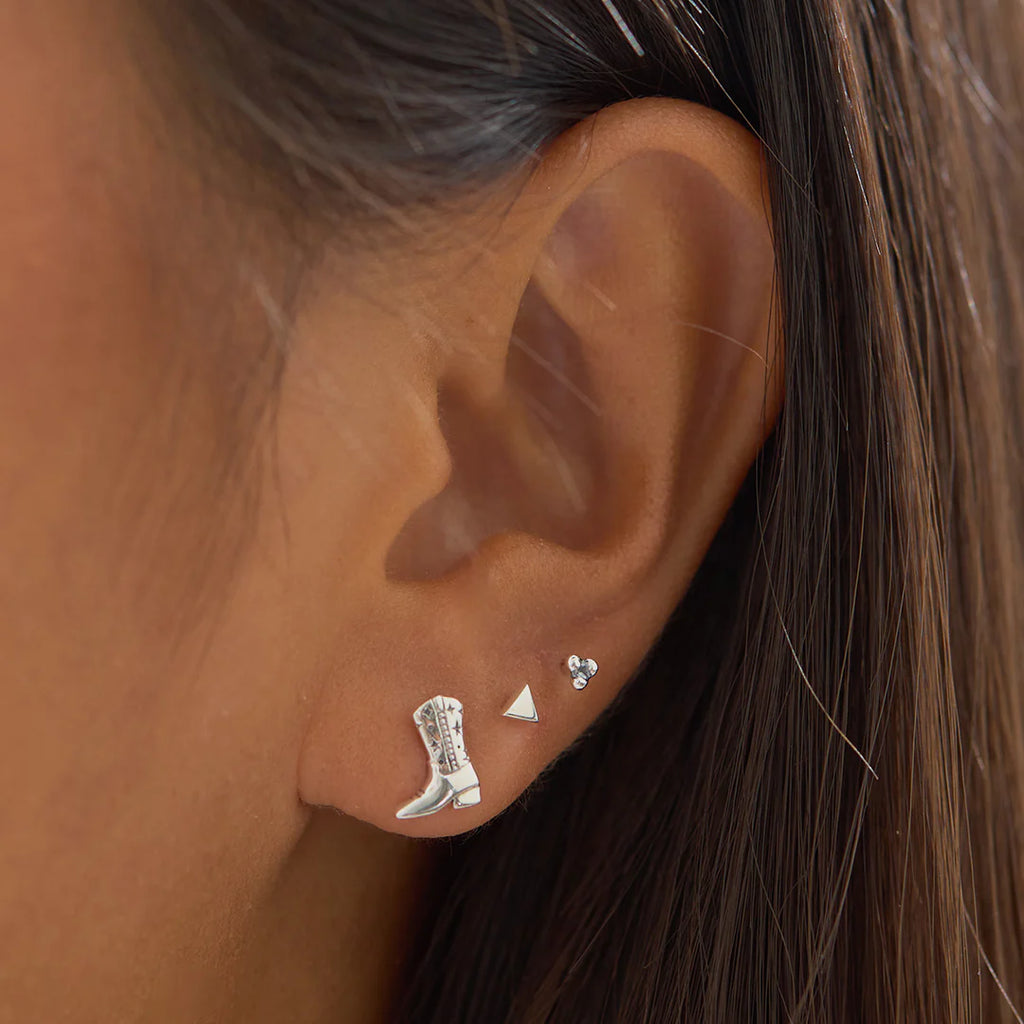 Tiny boots, big energy. These Sterling Silver cowgirl boot studs bring a wink of Western charm to your ear stack-etched with stars and moons for a celestial twist on the classic. Cute, nostalgic, and just a little unexpected.